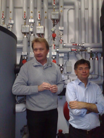 Geschäftsführer Karl Pirsch und Werner Kogler im hochmodernen Heizungs-Technik-Raum der Firma. Auf dem Flachdach ist die Erweiterung für eine Photovoltaik-Anlage bereits vorbereitet, allerdings aus finanziellen Gründen noch nicht realisiert. Der Holzbau ist mit 24 cm Steinwolledämmung in der Außenwand und 28 cm in den Dachelementen isoliert. Die Fensterverglasung besteht aus Dreischeiben-Isolierverglasung im Bürobereich. Eine passive Kühlung mittels Erdkollektoren und Nachtlüftung ist vorgesehen. Der geringe Heizungsbedarf wird durch eine Hackschnitzelheizung mit Leistungsreserve zur Stromerzeugung mittels Turbine abgedeckt. Die jährliche CO2-Ersparnis beträgt 120 Tonnen!